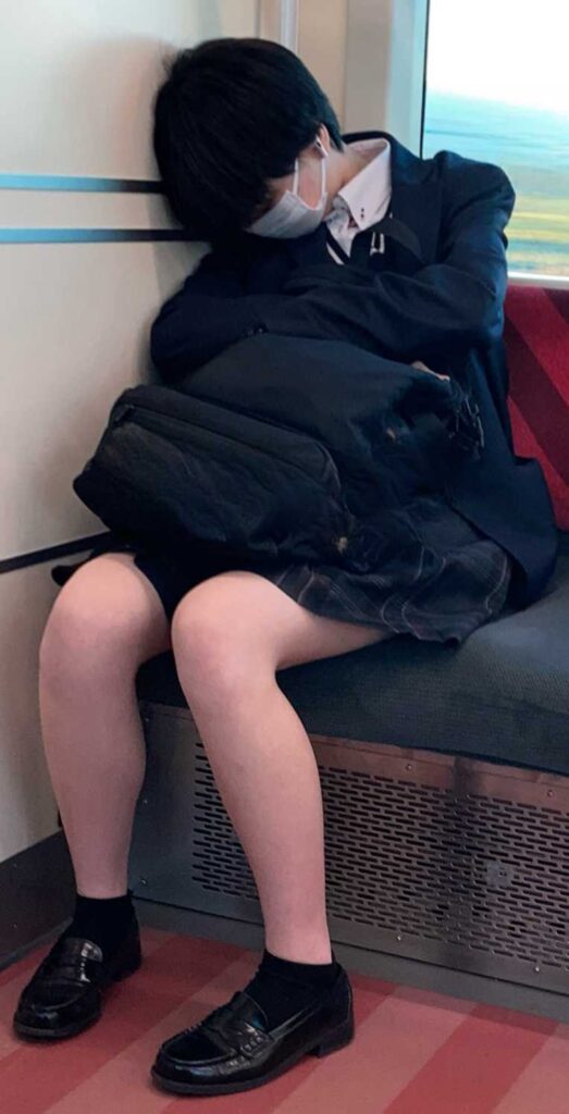 電車で寝ちゃってる制服JK
