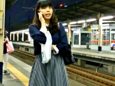 電車待ちをしているお姉さんの後ろに回り込んで逆さ撮りでお尻に食い込むパンティを盗撮!
